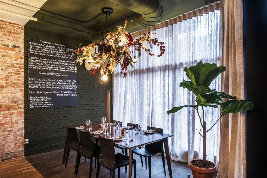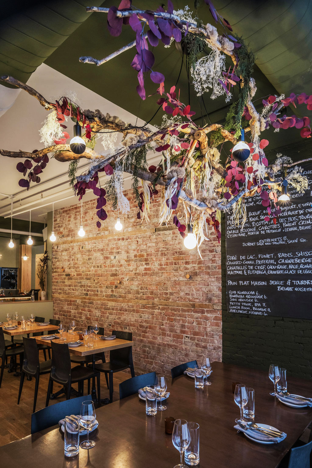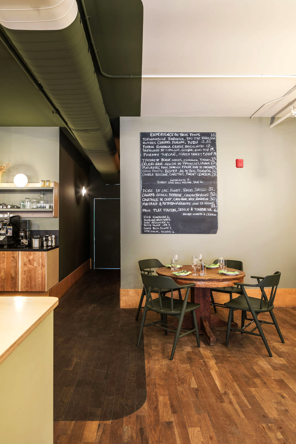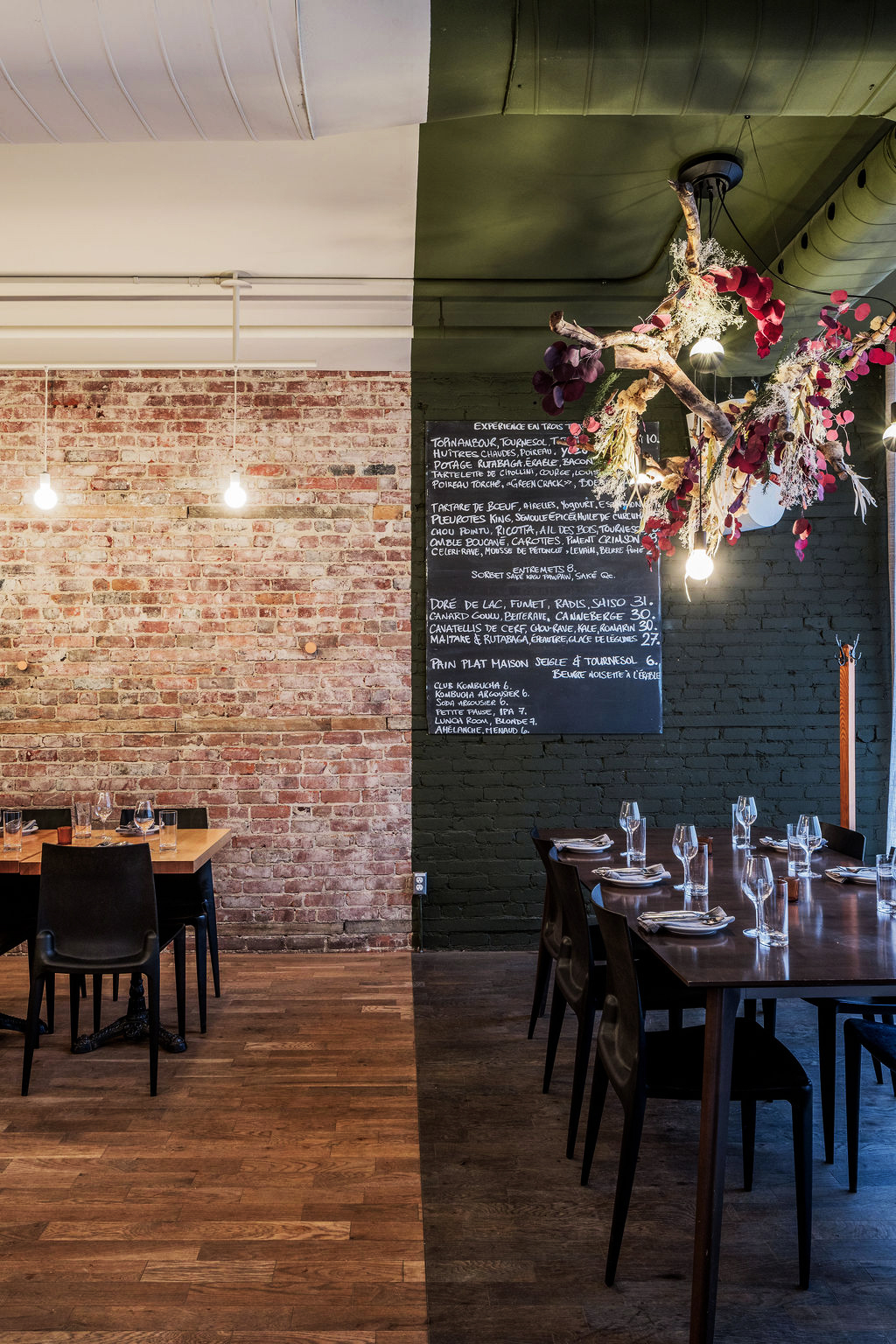 Le mandat confié à Clairoux visait à traduire, dans le design de l’espace, les valeurs fondamentales du restaurant : durabilité, authenticité et convivialité. L’utilisation de matériaux récupérés de l’ancien local, tels que les briques et ardoises intégrées au nouveau bar, témoigne de cette volonté de continuité et de respect de l’environnement. Les tables et chaises existantes ont été réutilisées, et de nouvelles pièces ont été soigneusement sélectionnées pour compléter l’aménagement, créant ainsi une atmosphère chaleureuse et authentique. (Tastet)