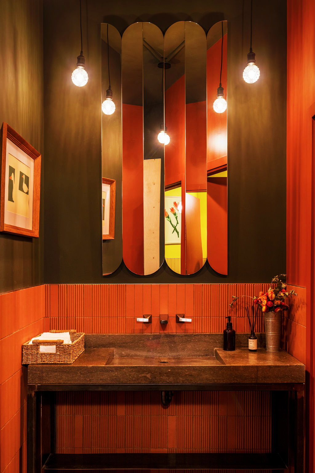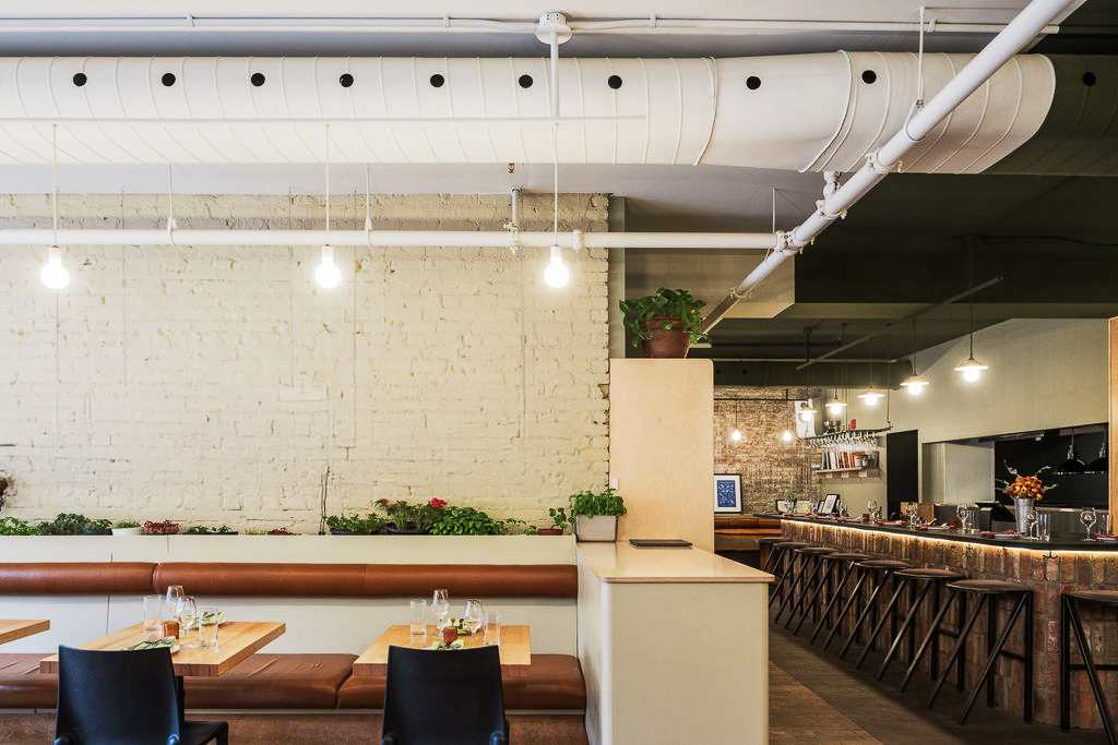 Le design intérieur mise sur la sobriété et la simplicité pour mettre en valeur l’assiette, véritable vedette du lieu. Les teintes naturelles, le bois et la brique apparente créent une ambiance conviviale, tandis que l’éclairage doux et les éléments décoratifs faits à partir de matériaux recyclés, comme les luminaires conçus à partir d’assiettes abîmées, ajoutent une touche d’originalité et de poésie à l’ensemble.