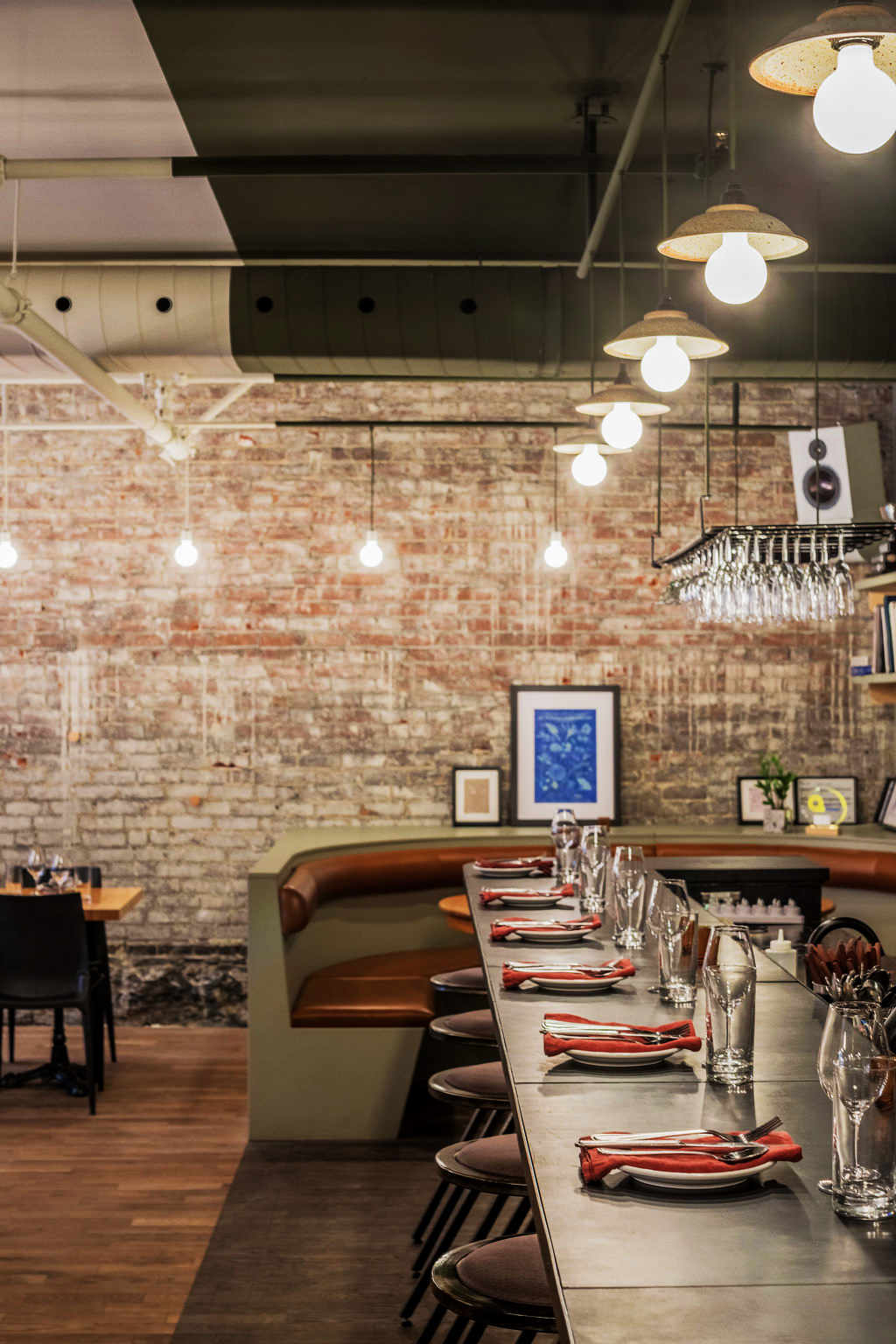 L’agencement de la salle a été pensé pour offrir une flexibilité maximale, permettant d’accueillir aussi bien des couples que des groupes. Une banquette allongée et des tables de différentes tailles facilitent l’adaptation de l’espace aux besoins variés de la clientèle. Le bar, désormais plus spacieux, offre une vue directe sur la cuisine, renforçant le lien entre les clients et l’équipe en cuisine.