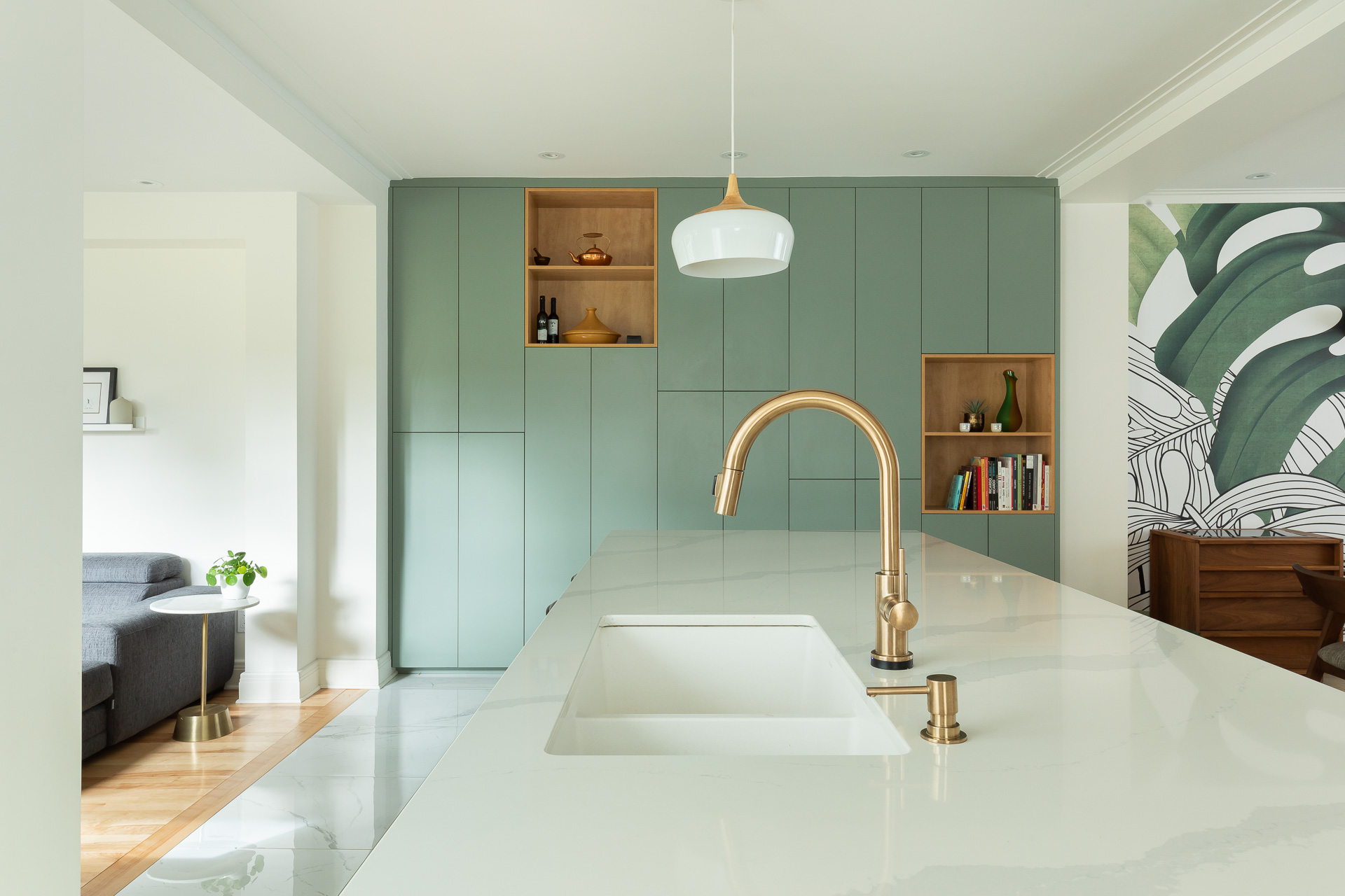 Nous avons accordé une grande importance à la circulation au sein de l’espace, aux perspectives et aux volumes. Nous avons pour cela privilégié des matériaux clairs tout en introduisant le vert qu’on retrouve sous 2 nuances.